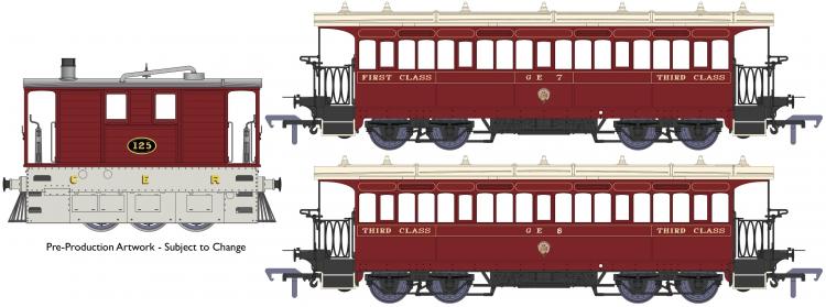 Each train pack will feature an appropriately numbered and liveried 'C53' alongside tram coaches No.7 and 8 in appropriate livery and physical condition for the time period.